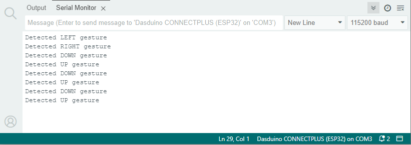 Open the Serial Monitor at 115200 baud to observe detected gestures.