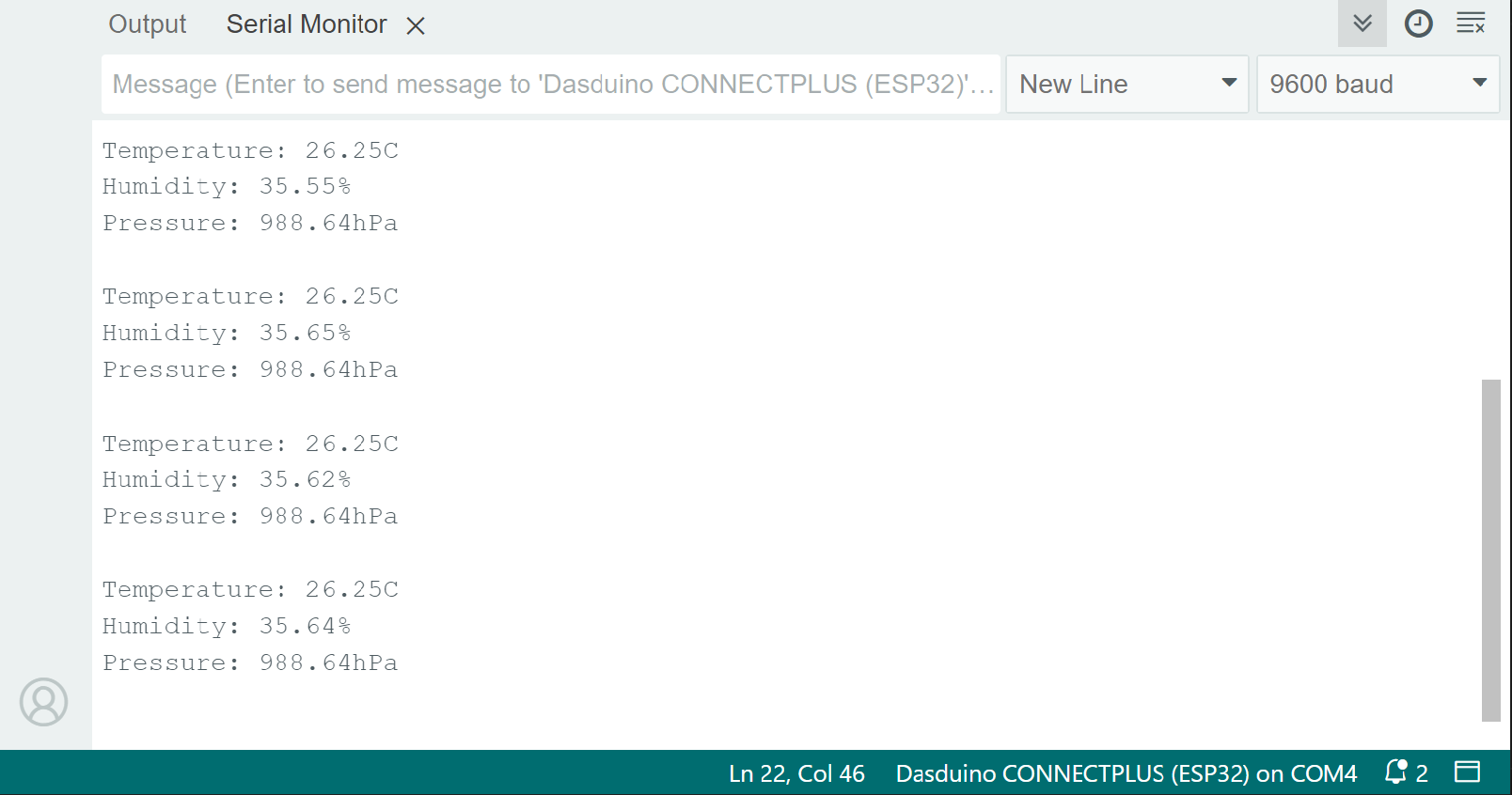 To get the values for all measurements (temperature, humidity, and pressure), use the readSensorData() function. The sensor gets the reading values, stores them in the addresses of the function arguments, and scales the values into the appropriate form.