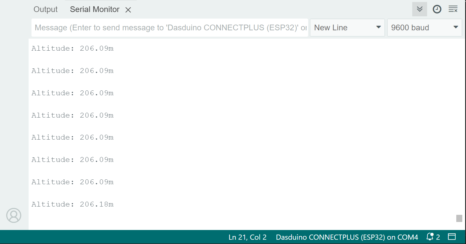 The altitude value can be calculated by using the readAltitude() function. The value is calculated based on the pressure reading and the sea level.