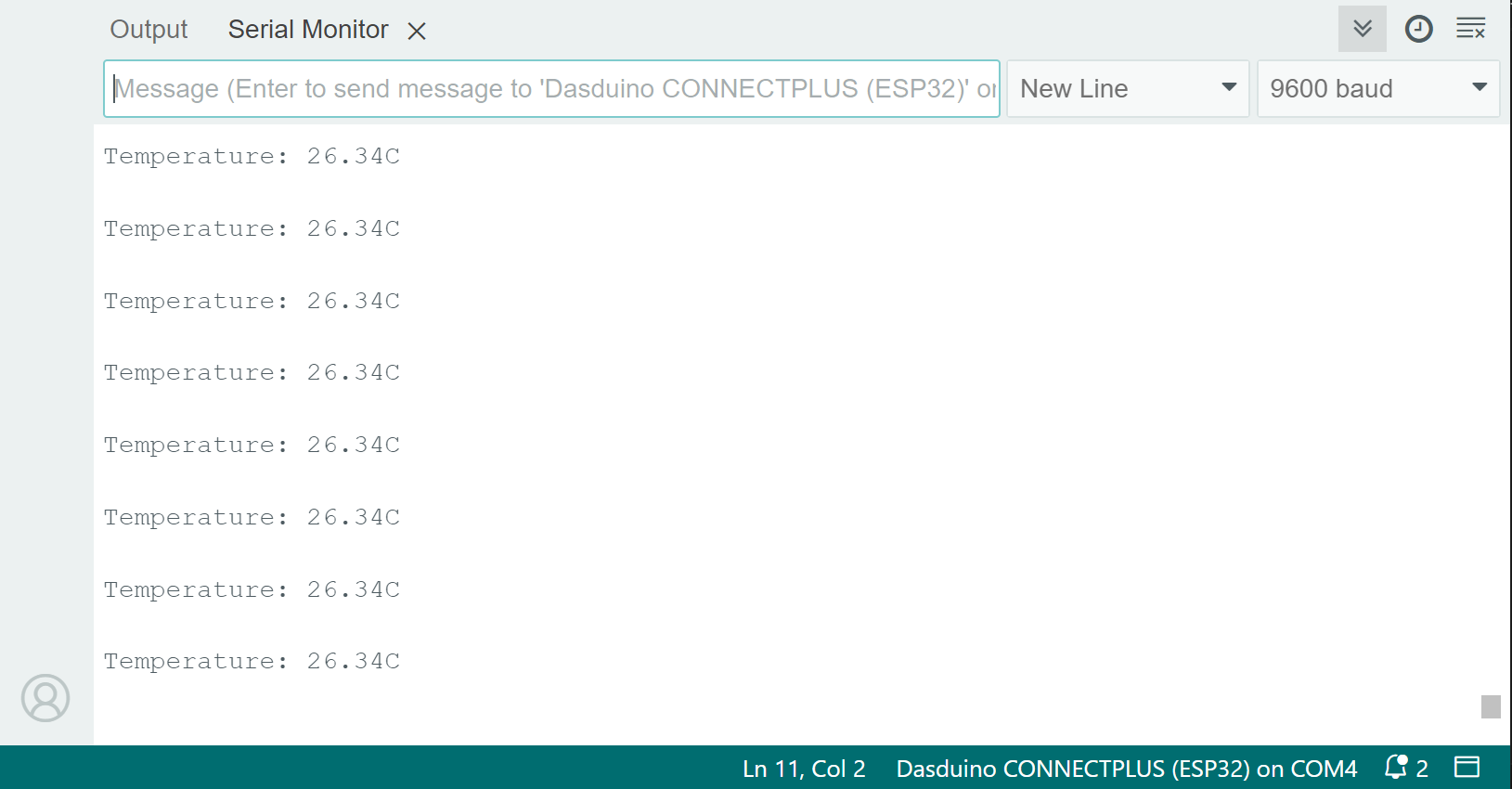 To get temperature values only, use the readTemperature() function. The sensor samples the temperature in degrees Celsius.