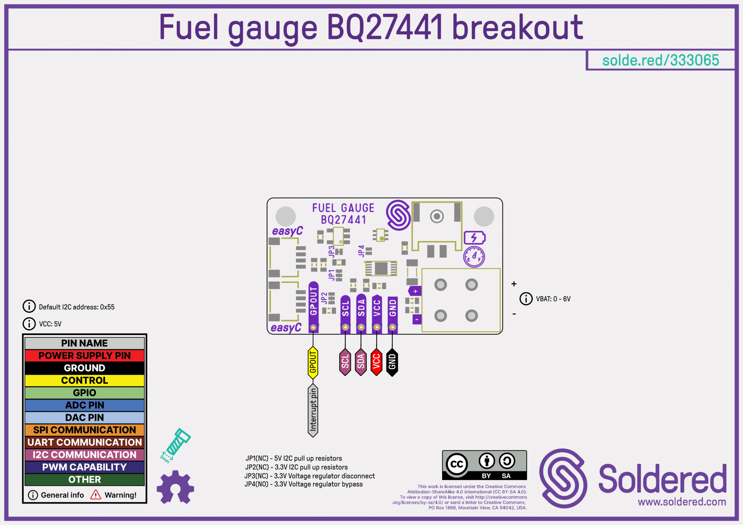 Hardware design, BOM, gerbers and 3D files for Fuel-gauge-BQ27441-breakout designed by Soldered Electronics.