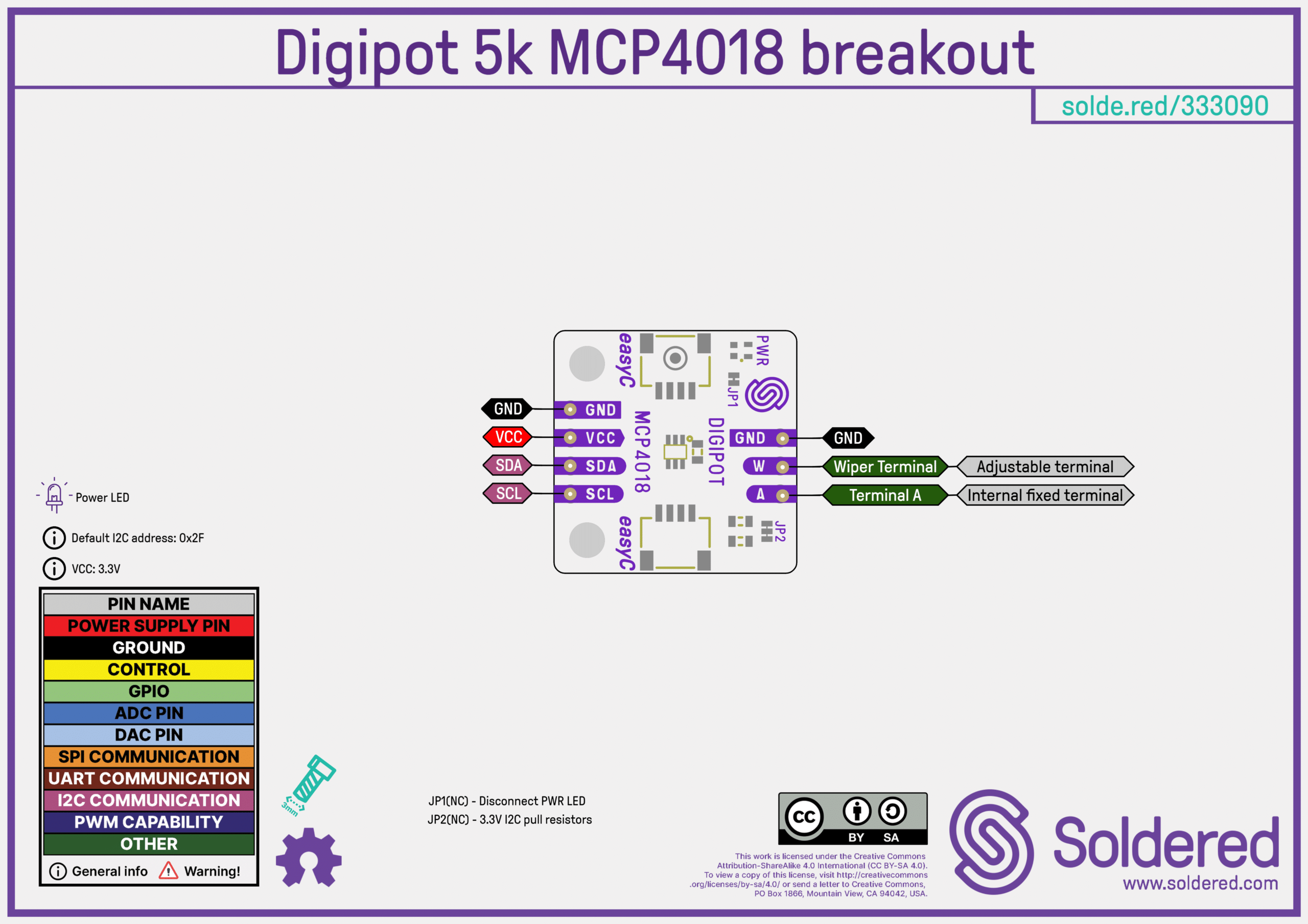 Hardware design, BOM, gerbers and 3D files for Digipot-5k-MCP4018-breakout designed by Soldered Electronics.