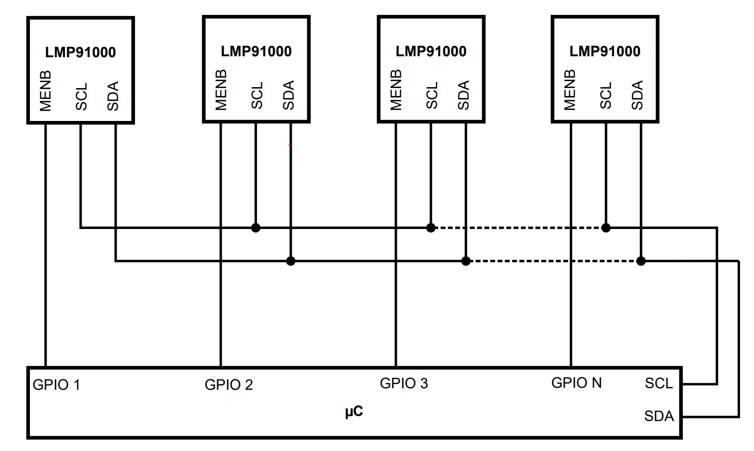 The LMP91000 comes with a unique and fixed I2C address of 0x48. It is still possible to connect more than one LMP91000 to an I2C bus and select each device using the LMPEN pin. The LMPEN simply enables or disables the I2C communication of the LMP91000. When the LMPEN is at a logic level low, all I2C communication is enabled; conversely, when the LMPEN is at a high logic level, I2C communication is disabled. In a system based on a microcontroller with more than one LMP91000 connected to the I2C bus, the I2C lines (SDA and SCL) are shared, while the LMPEN of each LMP91000 is connected to a dedicated GPIO port of the microcontroller. The microcontroller starts communication by asserting one out of N LMPEN signals, where N is the total number of LMP91000s connected to the I2C bus. Only the enabled device will acknowledge the I2C commands. After finishing communication with this particular LMP91000, the microcontroller de-asserts the corresponding LMPEN and repeats the procedure for the other LMP91000s.