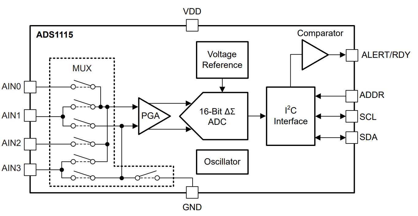 The ADS1115 is a 16-bit precision analog-to-digital converter (ADC) that measures small single-ended voltage signals using an internal programmable gain amplifier (PGA) and a sigma-delta modulator. It communicates via I2C and features four input channels, a reference voltage, and an onboard oscillator. The ADC samples the input voltage, compares it to the reference, and converts it into a digital value through oversampling and noise shaping.