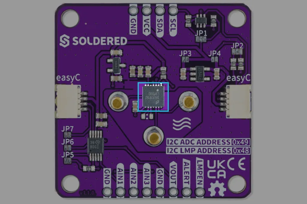 Since we are communicating with the board via I2C, the analog output we get from the LMP91000 must be converted into a digital signal.