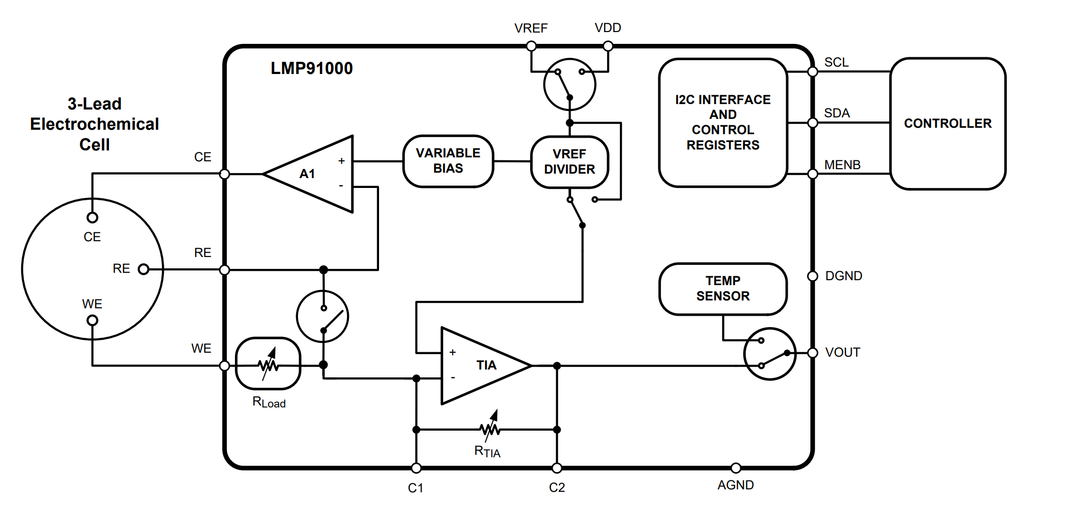 The core of the LMP91000 is a potentiostat circuit. It consists of a differential input amplifier used to compare the potential between the working and reference electrodes to a required working bias potential (set by the Variable Bias circuitry). Any changes in the impedance between the working and reference electrodes will cause a change in the voltage applied to the counter electrode to maintain the constant voltage between them. A Transimpedance Amplifier connected to the working electrode is used to provide an output voltage that is proportional to the cell current. The working electrode is held at virtual (internal) ground by the transimpedance amplifier. The potentiostat compares the reference voltage to the desired bias potential and adjusts the voltage at the counter electrode to maintain the proper working-to-reference voltage.