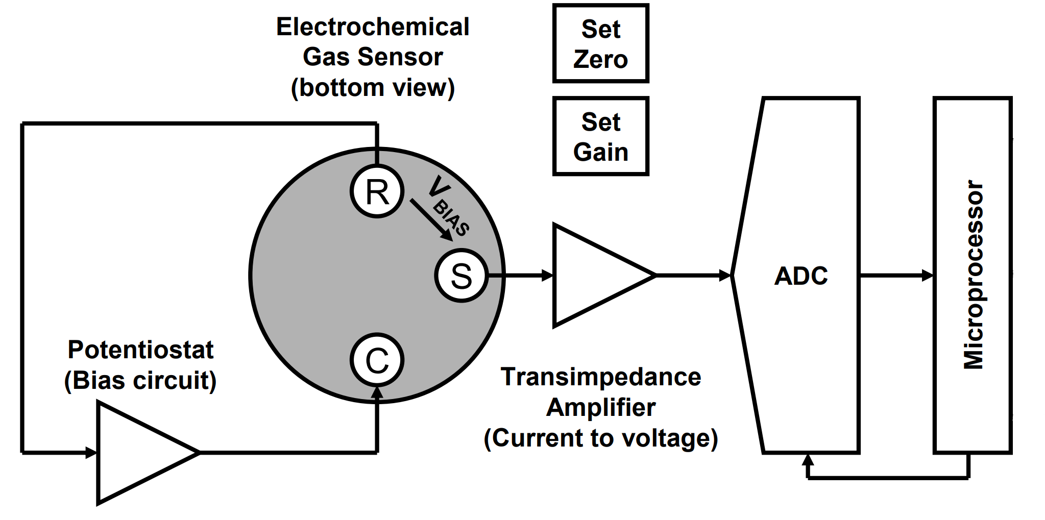 The electrochemical gas sensor requires a bias circuit known as a potentiostat to maintain the correct bias potential between the sensing and reference electrodes, as stated on the individual sensor datasheet: