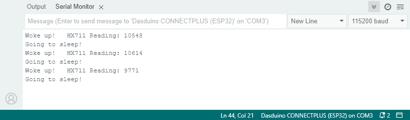 In this code snippet, the loop() function wakes up the HX711 from deep sleep, takes a raw reading, prints the result to the Serial Monitor, and then puts the HX711 back into deep sleep mode. The program waits for 15 seconds before repeating the process.