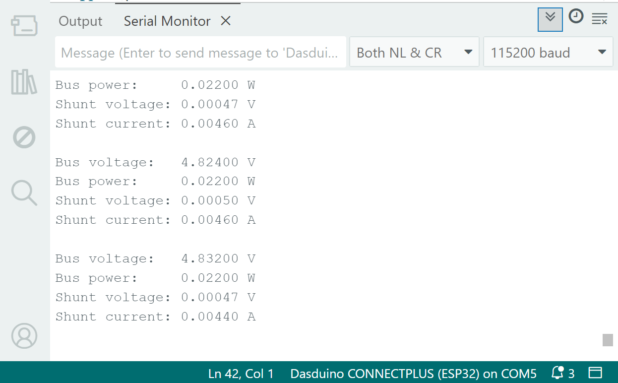 In the loop() function, we take measurements of the bus voltage, power, shunt voltage, and shunt current: