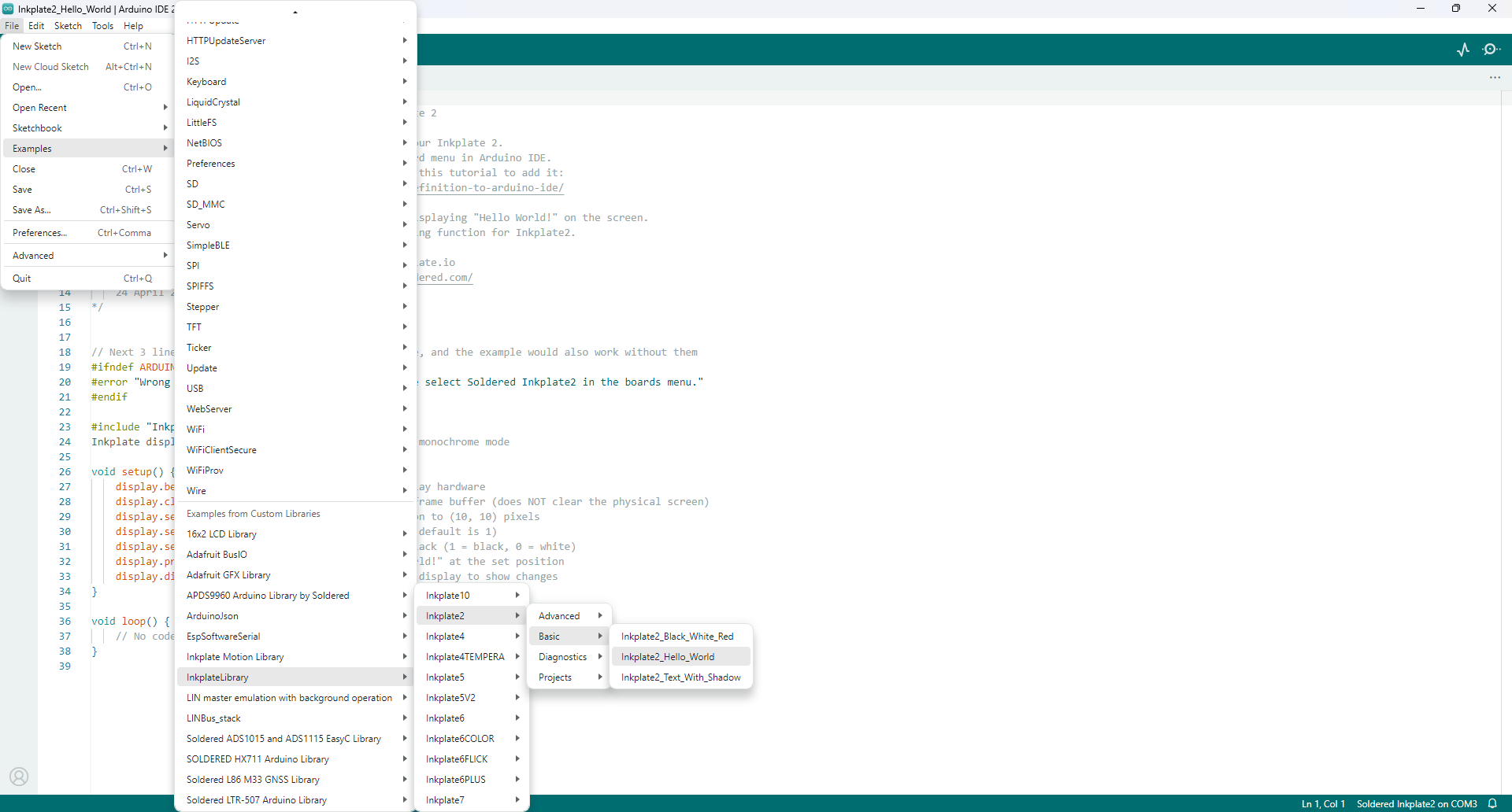 For the needs of this documentation, we will be using a premade example. Go to File->Examples->InkplateLibrary->Inkplate2->Basic->Inkplate2_Hello_World