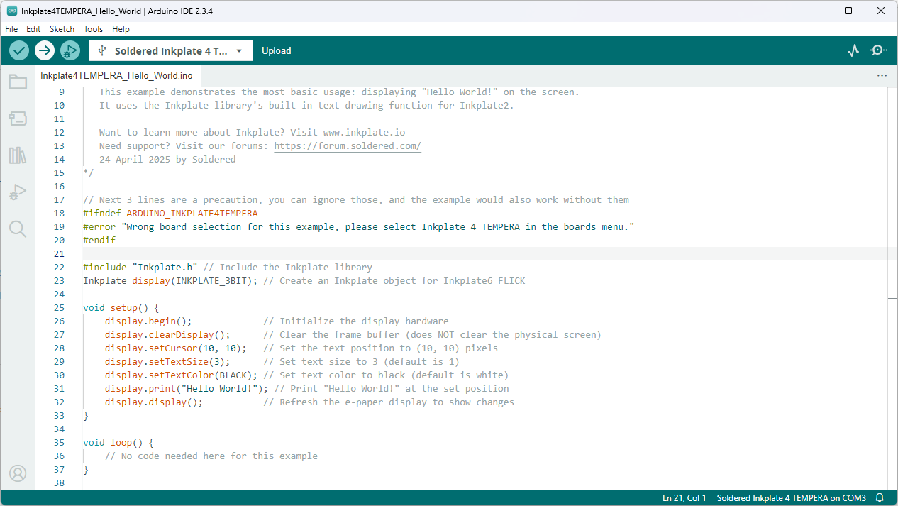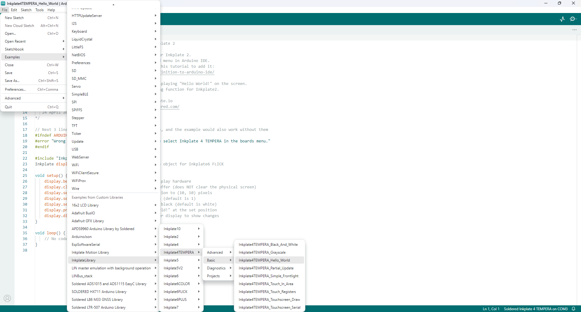 File->Examples->InkplateLibrary->Inkplate4TEMPERA->Basic->Inkplate4TEMPERA_Hello_World
