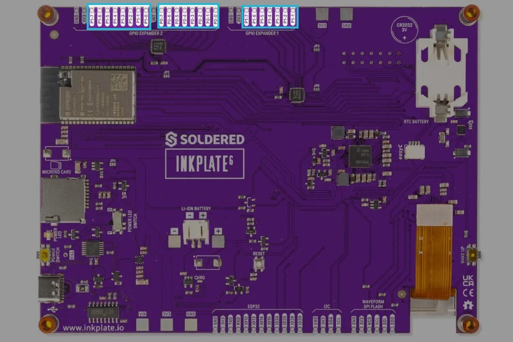 Inkplate 6's onboard ESP32 WROVER-E has some pins reserved for internal use (for example, the connection to the e-paper display) and cannot be used for end-user applications. This page contains a list of the available GPIO pins that can be used for external applications.
