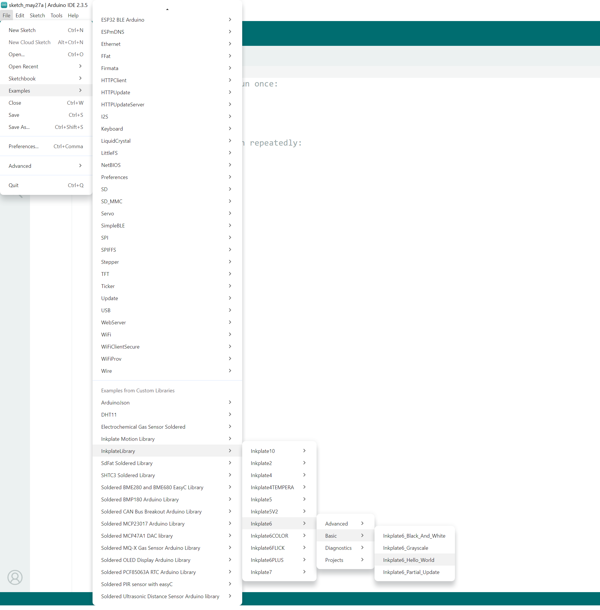 For this documentation, we will use a pre-made example. Go to File->Examples->InkplateLibrary->Inkplate6->Basic->Inkplate6_Hello_World.