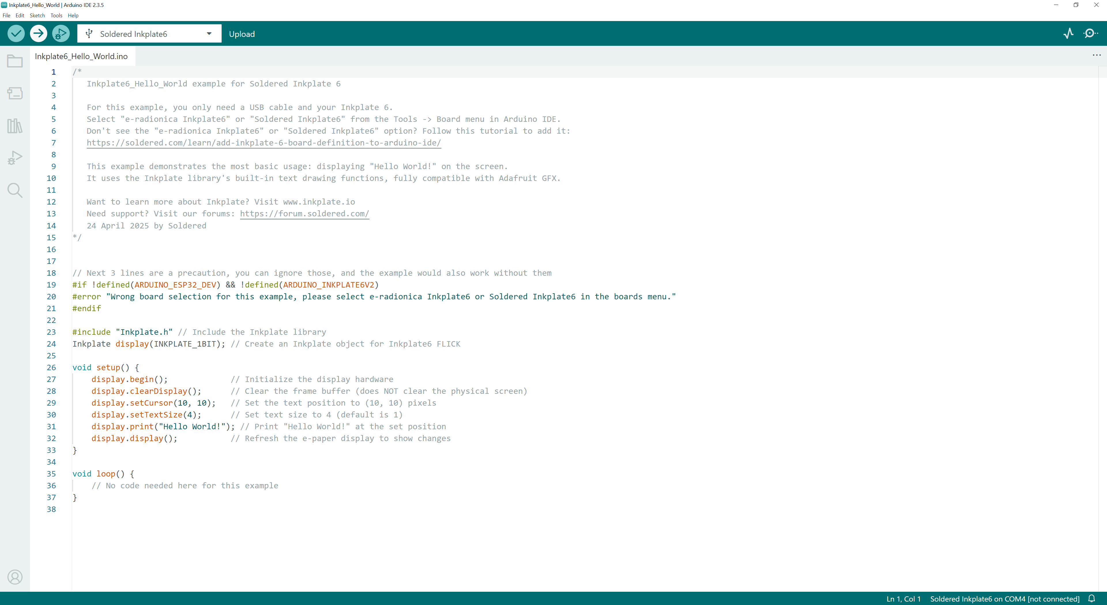 Inkplate 6 setup is complete. Now try out some examples from the Arduino library—upload them and see the results for yourself!