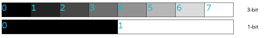3-bit or grayscale mode offers the possibility to draw in 8 different levels of brightness, not just black and white. See below for an approximate visualization of black levels corresponding to their numerical values in code: