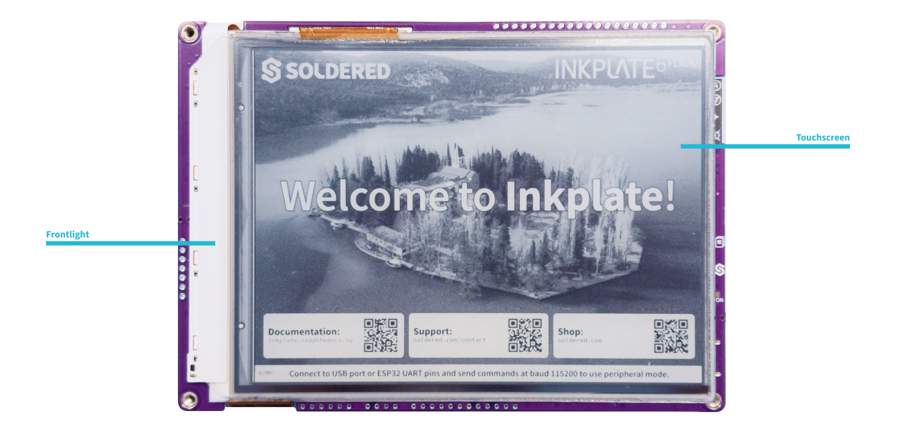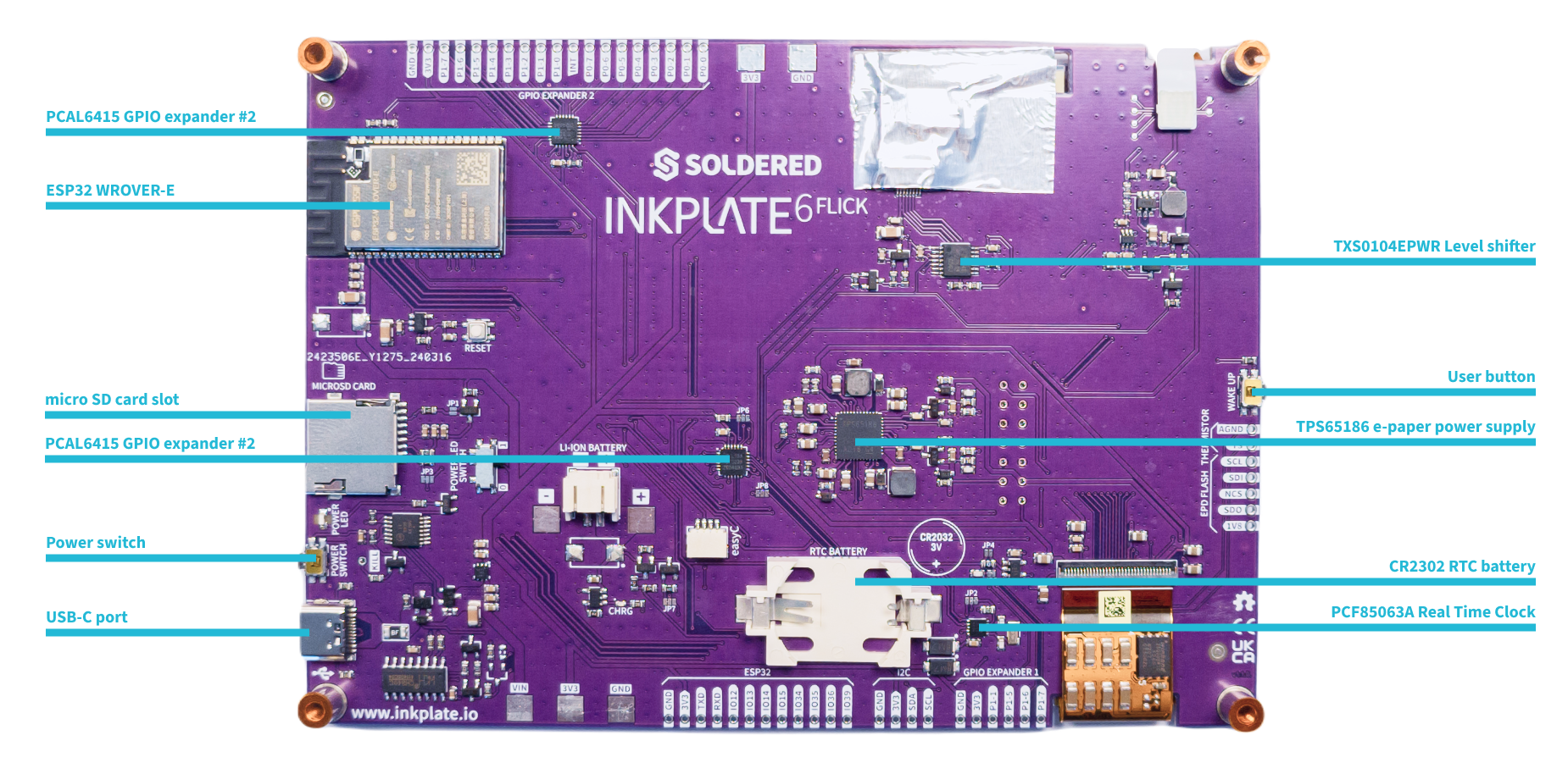 Inkplate 6Flick features a 6.0″ E Ink display powered by an ESP32 microcontroller, offering built-in Wi-Fi and Bluetooth connectivity. The board also includes: