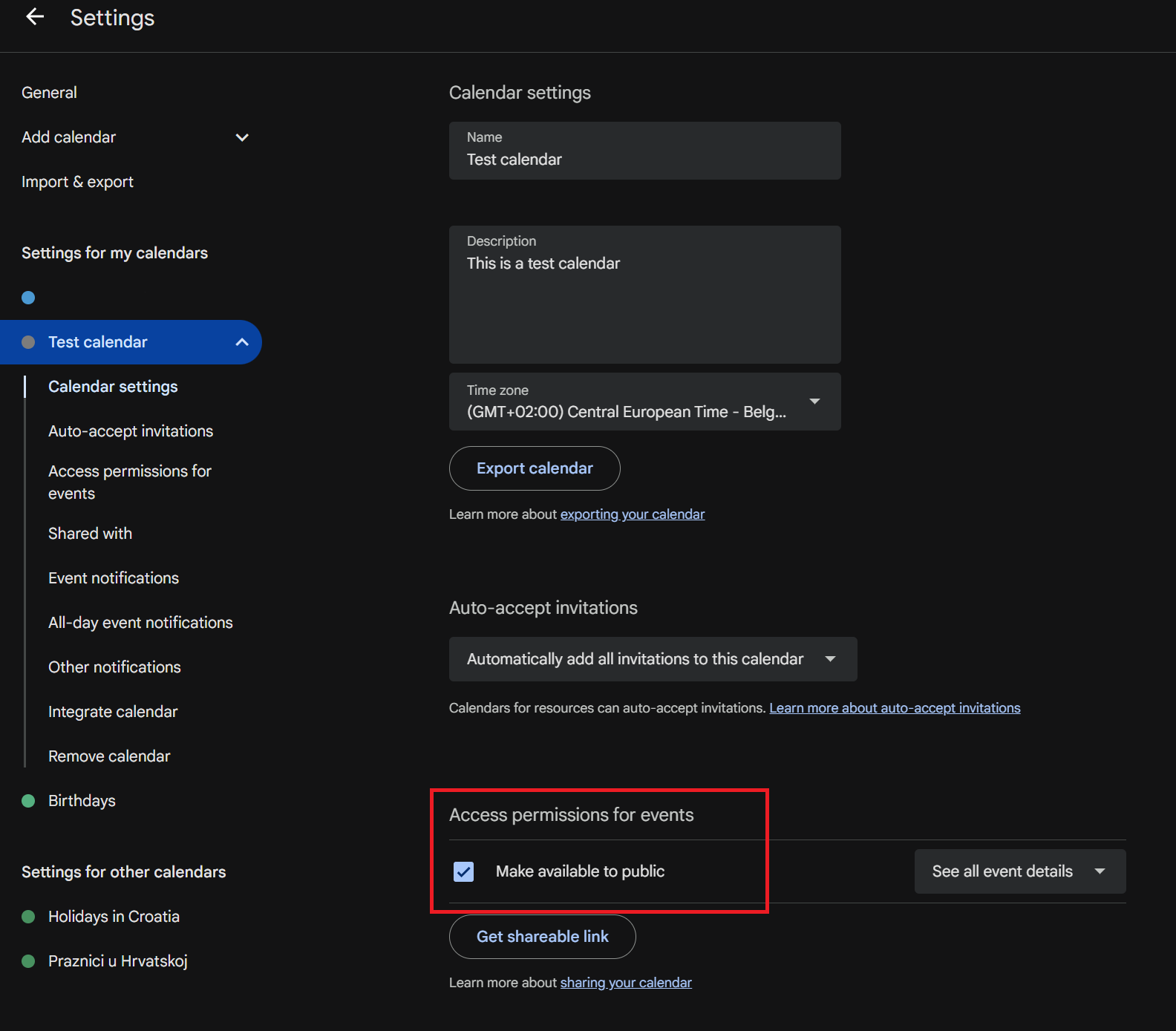 We also have to make the calendar publicly accessible. You can do this on the same page by going to Access permissions for events: