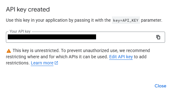 After clicking on the API key button, the API key will be created and you will be presented with the following screen: