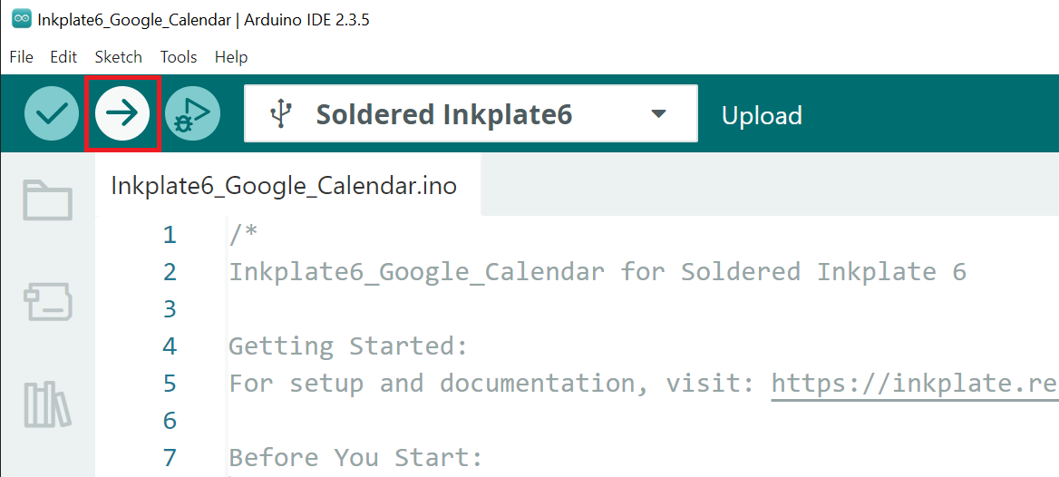 After completing all the previous steps, uploading the project to the Inkplate is as simple as just pressing the upload button in the Arduino IDE: