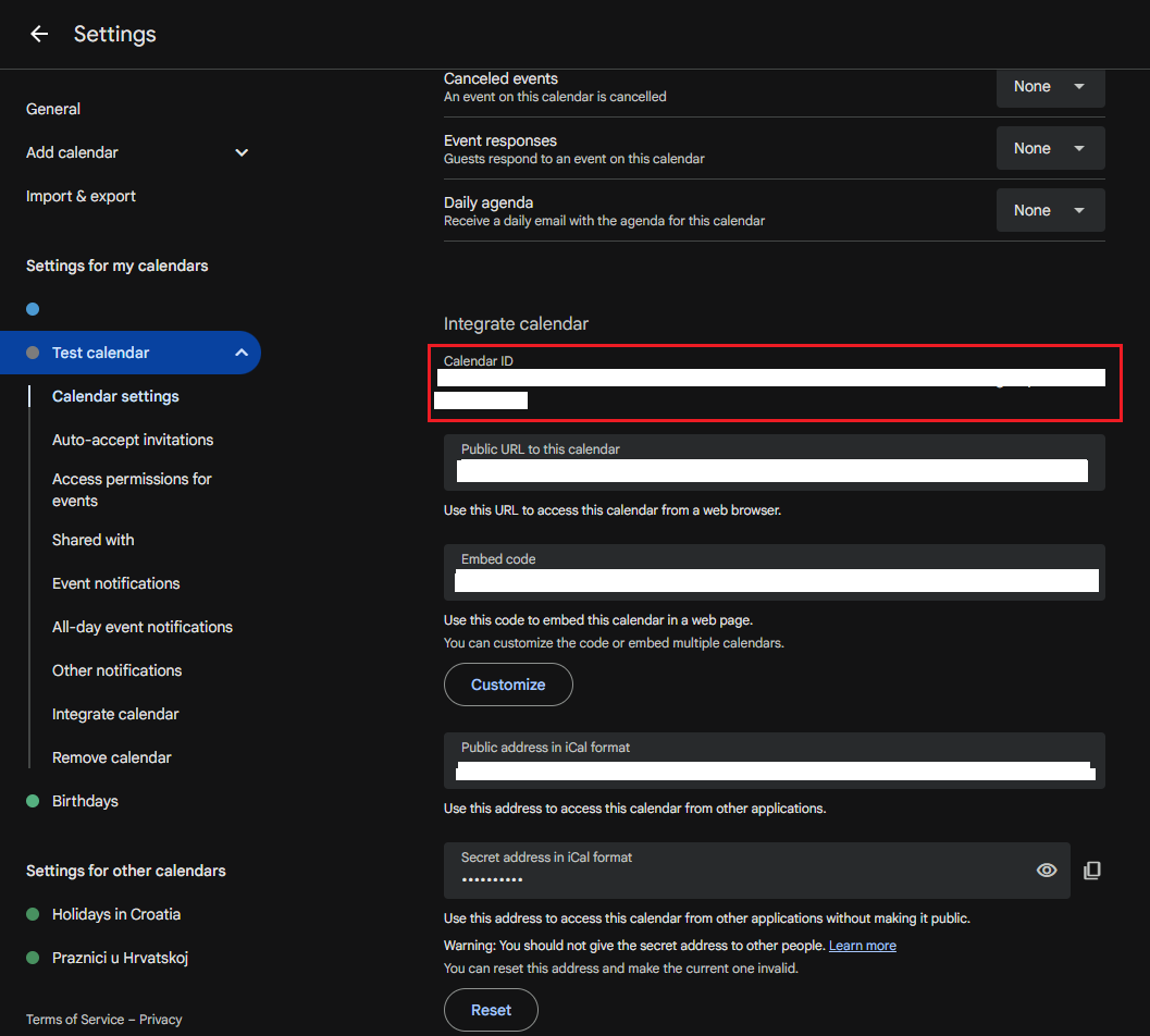 Next, go to the specific calendar you want to track and scroll down until you find the CalendarID: