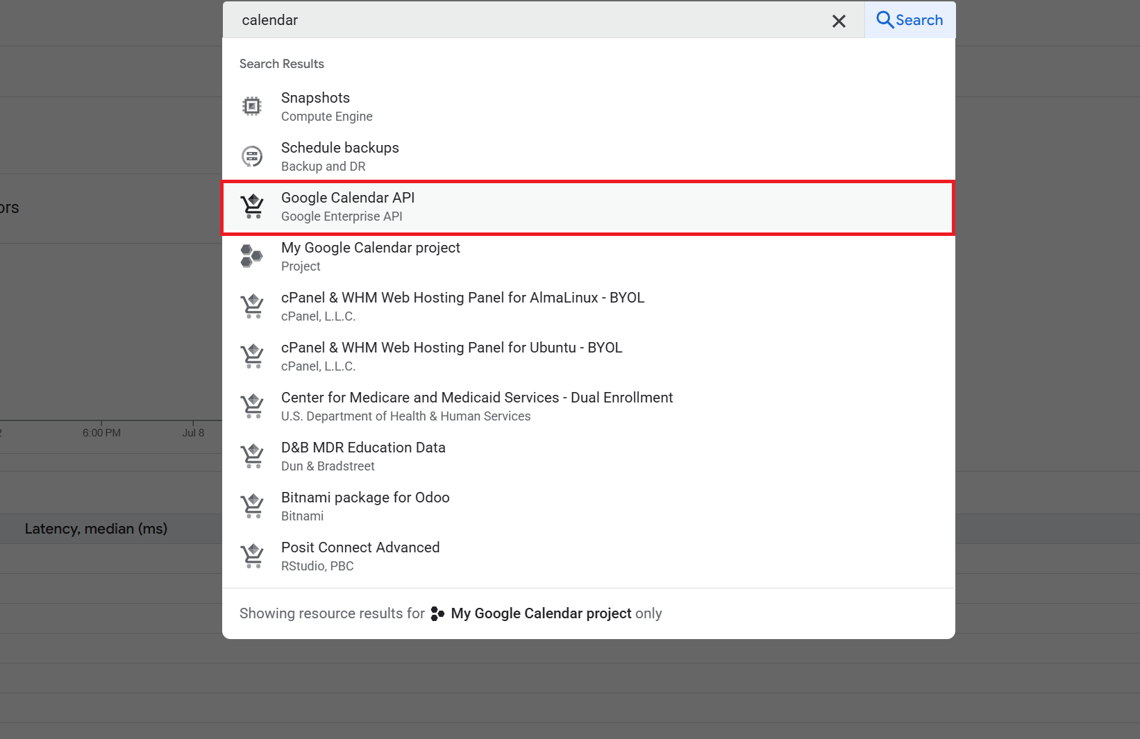 It is also required to enable the Google Calendar API within the project. Go to APIs & Services and use the search bar at the top to search for Google Calendar API: