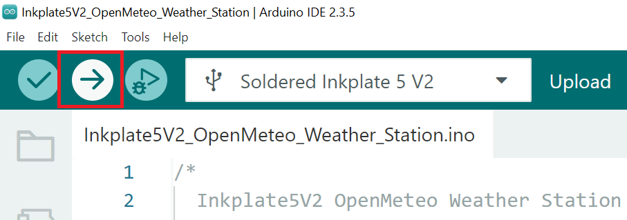 After completing all the previous steps, uploading the project to the Inkplate is as simple as pressing the upload button in the Arduino IDE: