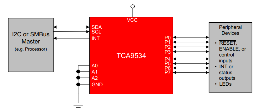 I/O expanders such as the TCA9534 provide a simple solution when additional I/Os are needed for switches, sensors, push-buttons, LEDs, fans, and other similar devices.