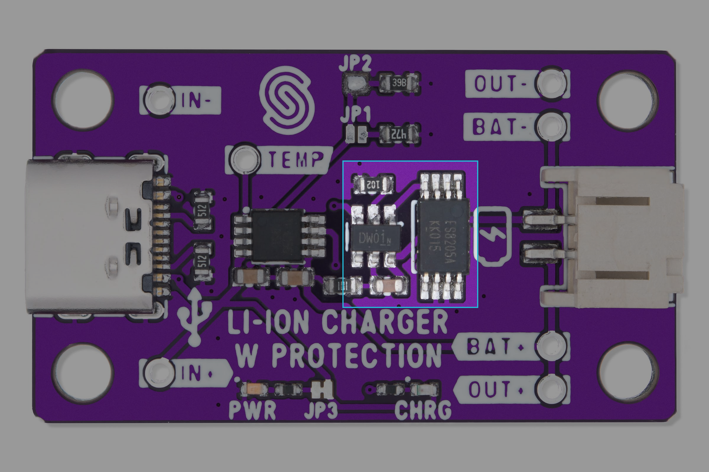 The Li-ion Charger with Protection includes the DW01A battery protection IC and FS8205A dual MOSFET to guard against overcharge, overdischarge, and short circuits.
