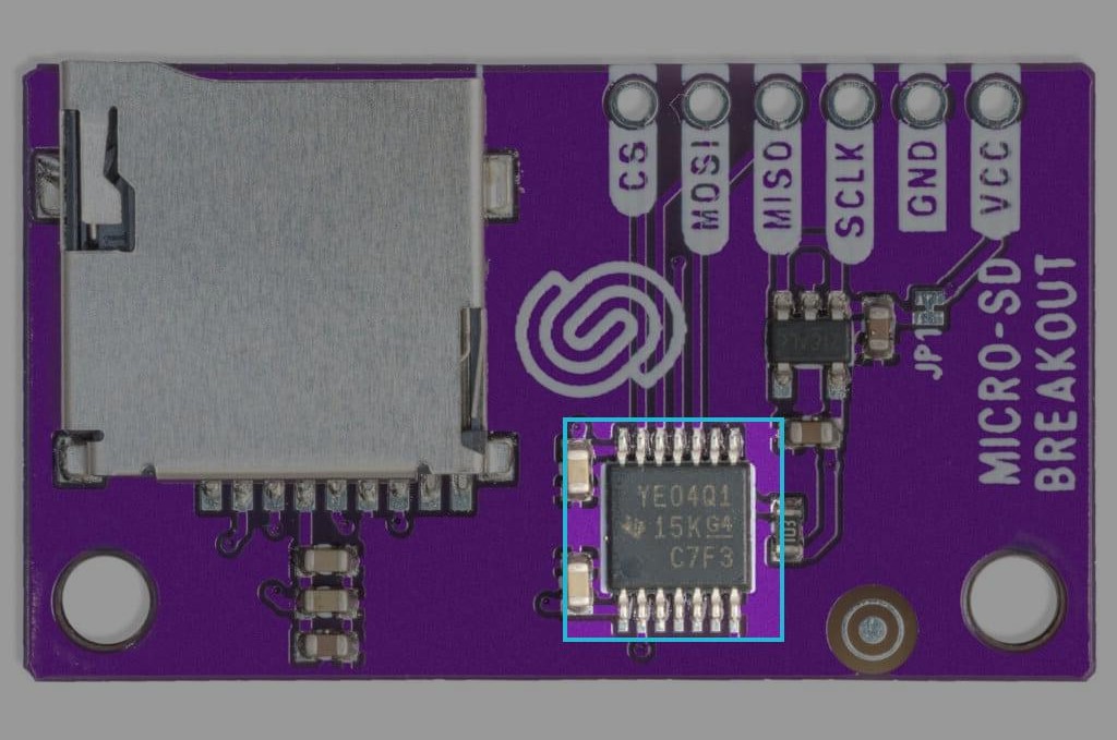 The SD card reader's communication is handled by the TXB0104 chip from Texas Instruments.