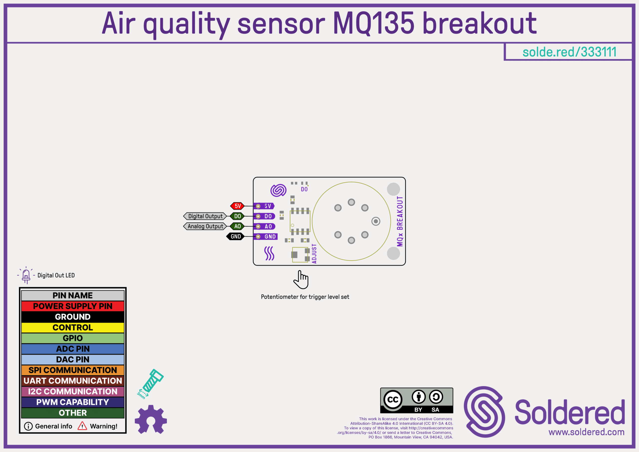 | DO | Digital Output | Set to HIGH when sensor reads gas concentration over the trigger level set by the onboard potentiometer |