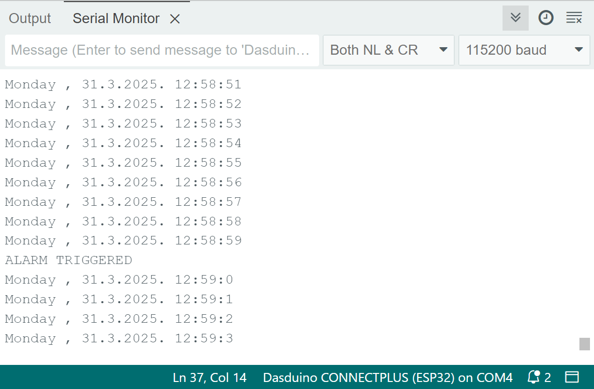 When the alarm is triggered, an interrupt occurs and we print the message "ALARM TRIGGERED" to the serial monitor: