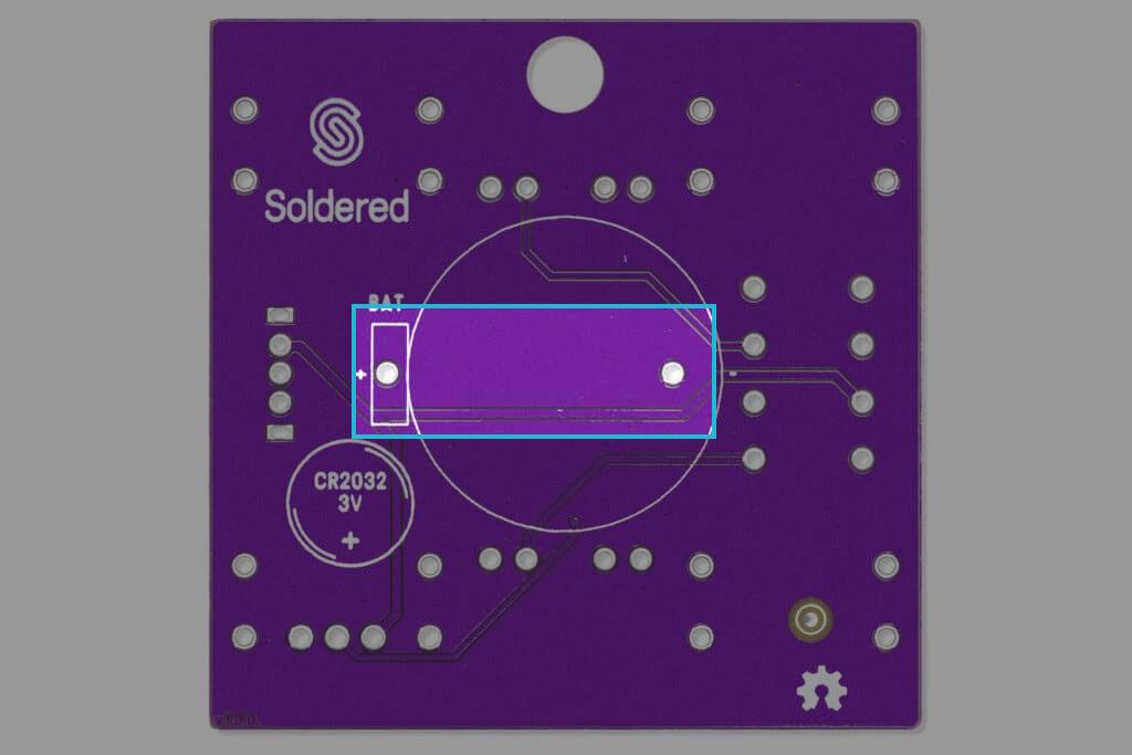 Rotate the pcb on its back side up and align the holder with drawn topology on pins marked BAT.