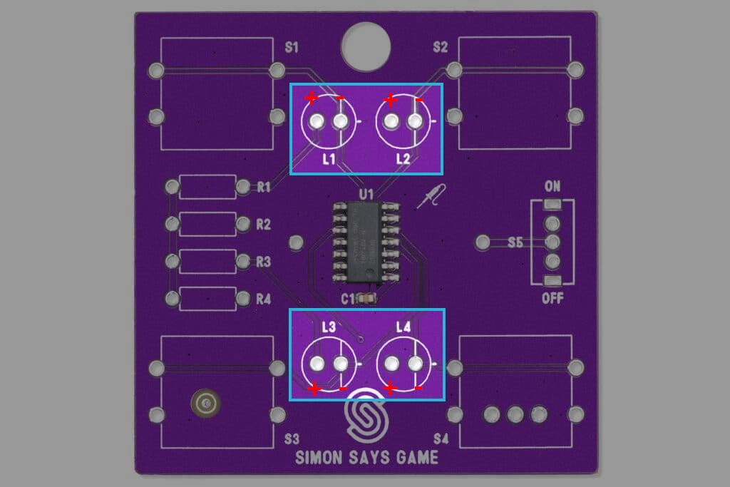 Solder the LEDs on pins marked L1 to L4. Keep in mind that the LED's cathode (-) is on the left pin, and anode (+) is on the right side!