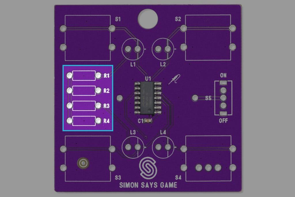 Solder the 330 Ohm resistors to the PCB on pins marked R1 to R4. their orientation doesn't matter.