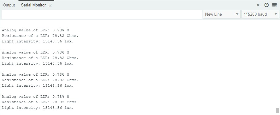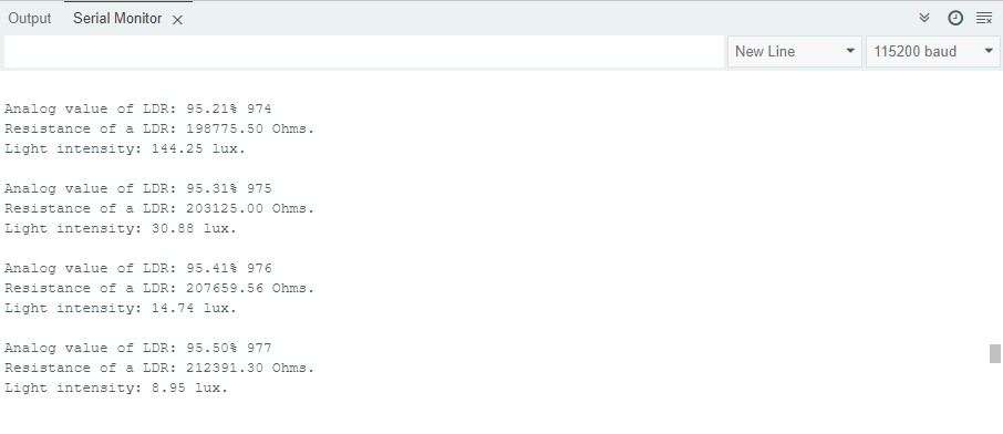 Serial.println(sensor.getRawValue()); // Print raw value of the LDR