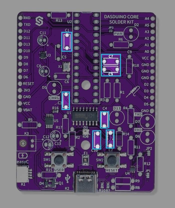 Solder the 100nF capacitors to the pcb on pins marked C1,C2,C3,C4,C7,C9,C10. These capacitors are non-polarized capacitors, which means that their orientation doesn't matter.