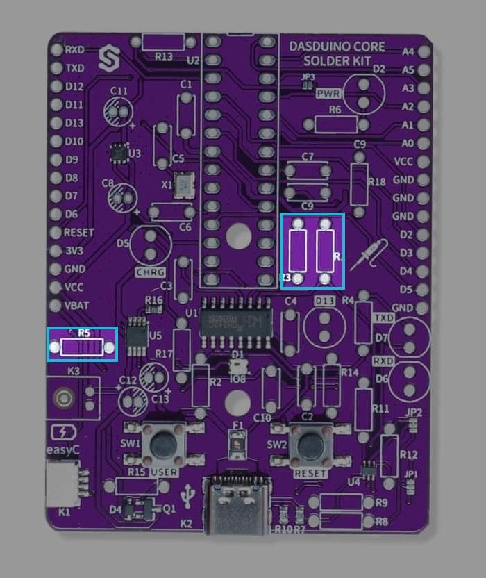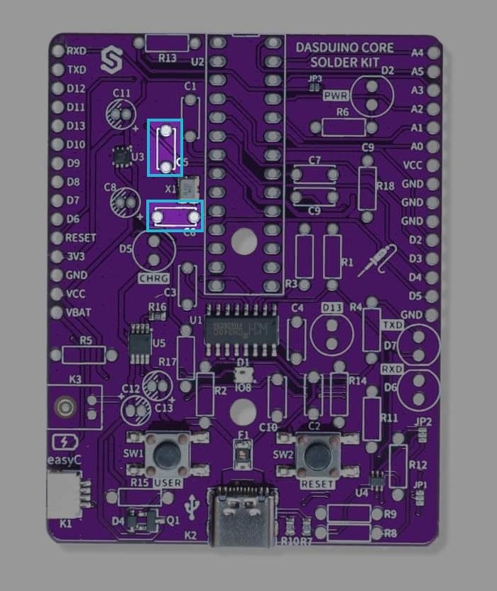Solder the 100nF capacitors to the pcb on pins marked C5,C6. These capacitors are non-polarized capacitors, which means that their orientation doesn't matter.