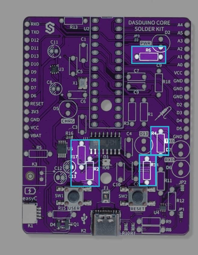 Solder the 1kOhm resistors to the pbc on pins marked R1, R3, R5. Their orientation doesn't matter.