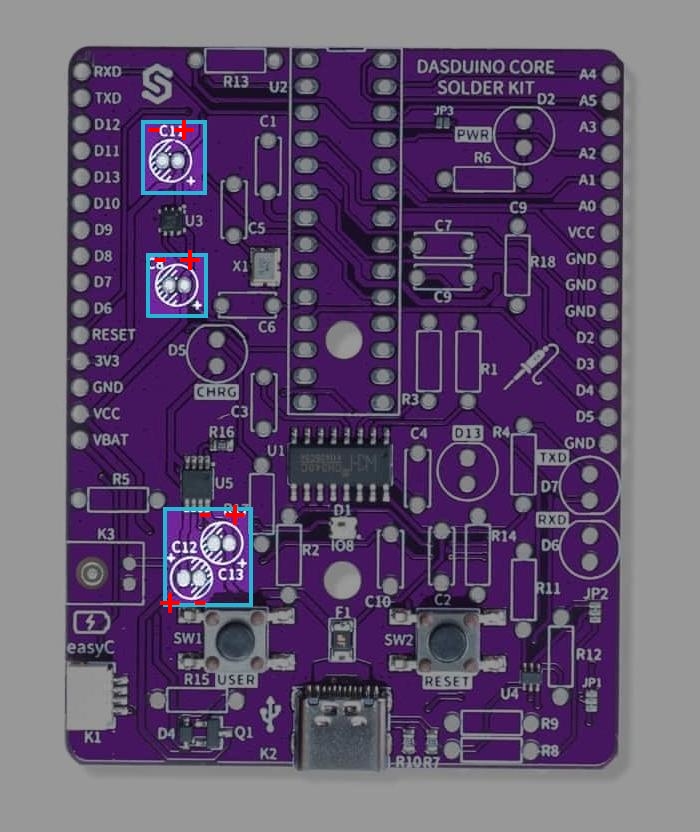 Solder the 100nF capacitors to the pcb on pins marked C8,C11,C12,C13. These capacitors are polarized capacitors, which means that their anode (+) must be soldered to + marked side on pins.