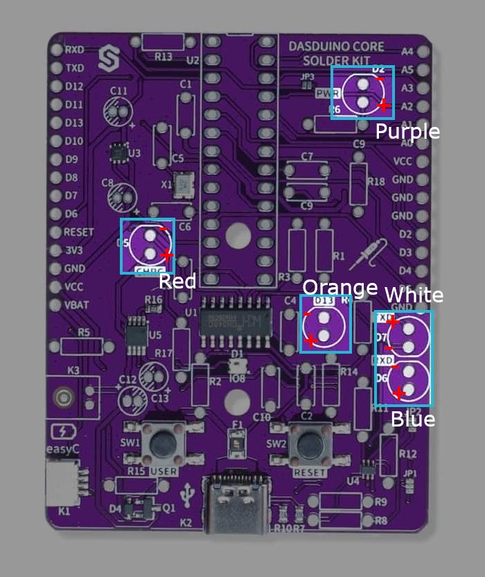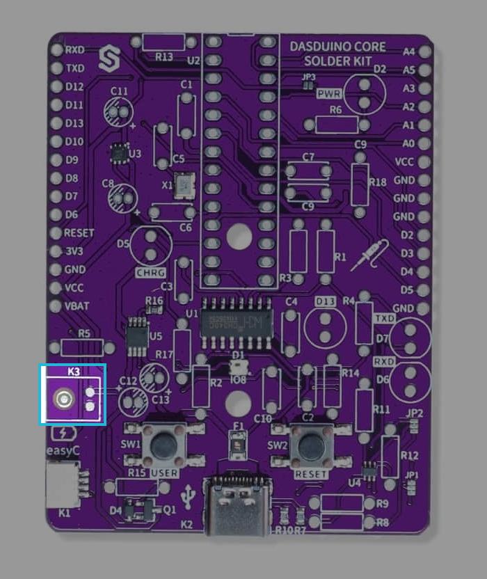 Solder the JST battery connctor to the pcb on pins marked K3, make sure that the connector covers it's drawn topology (That it's facing outwards).