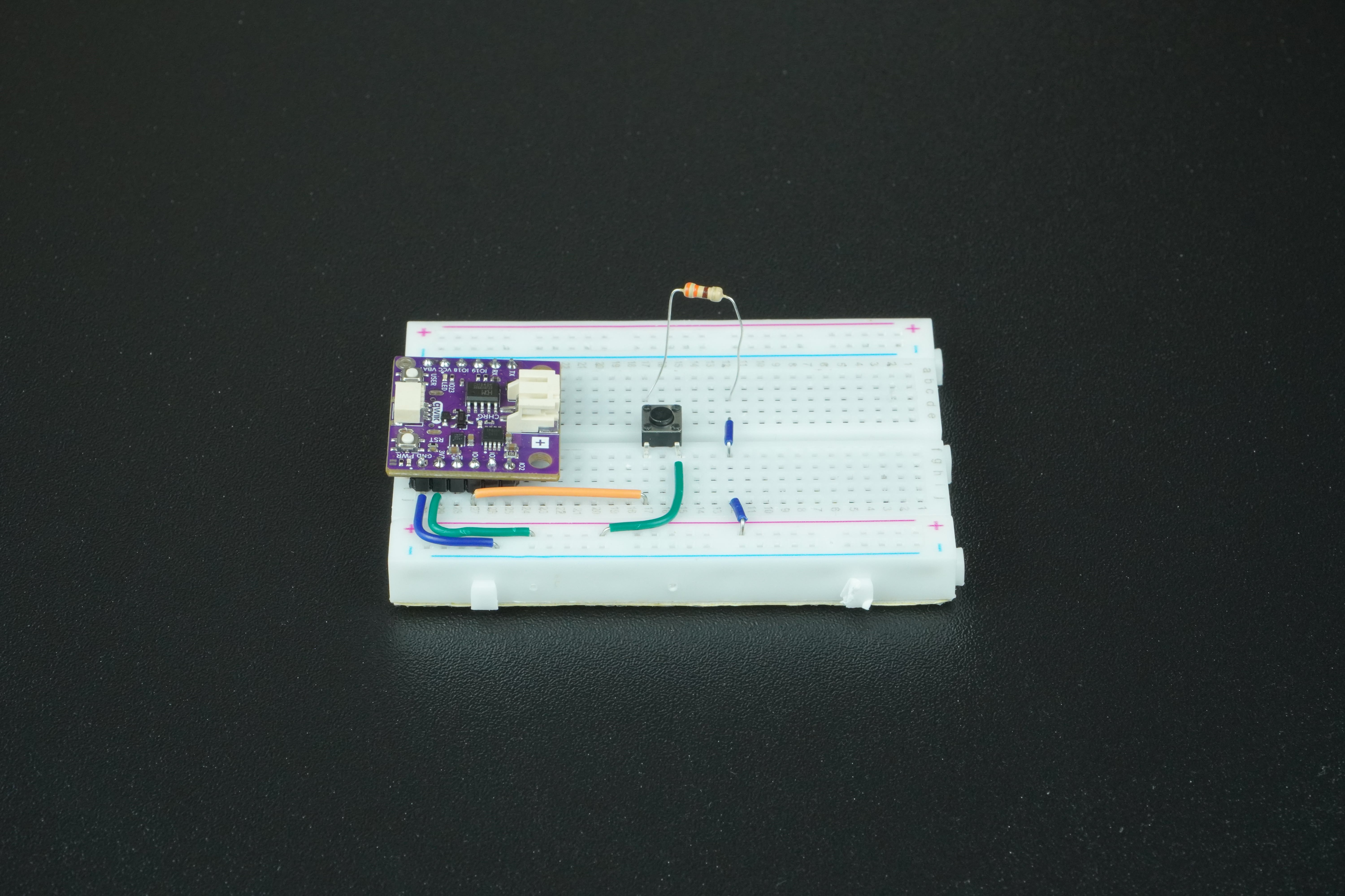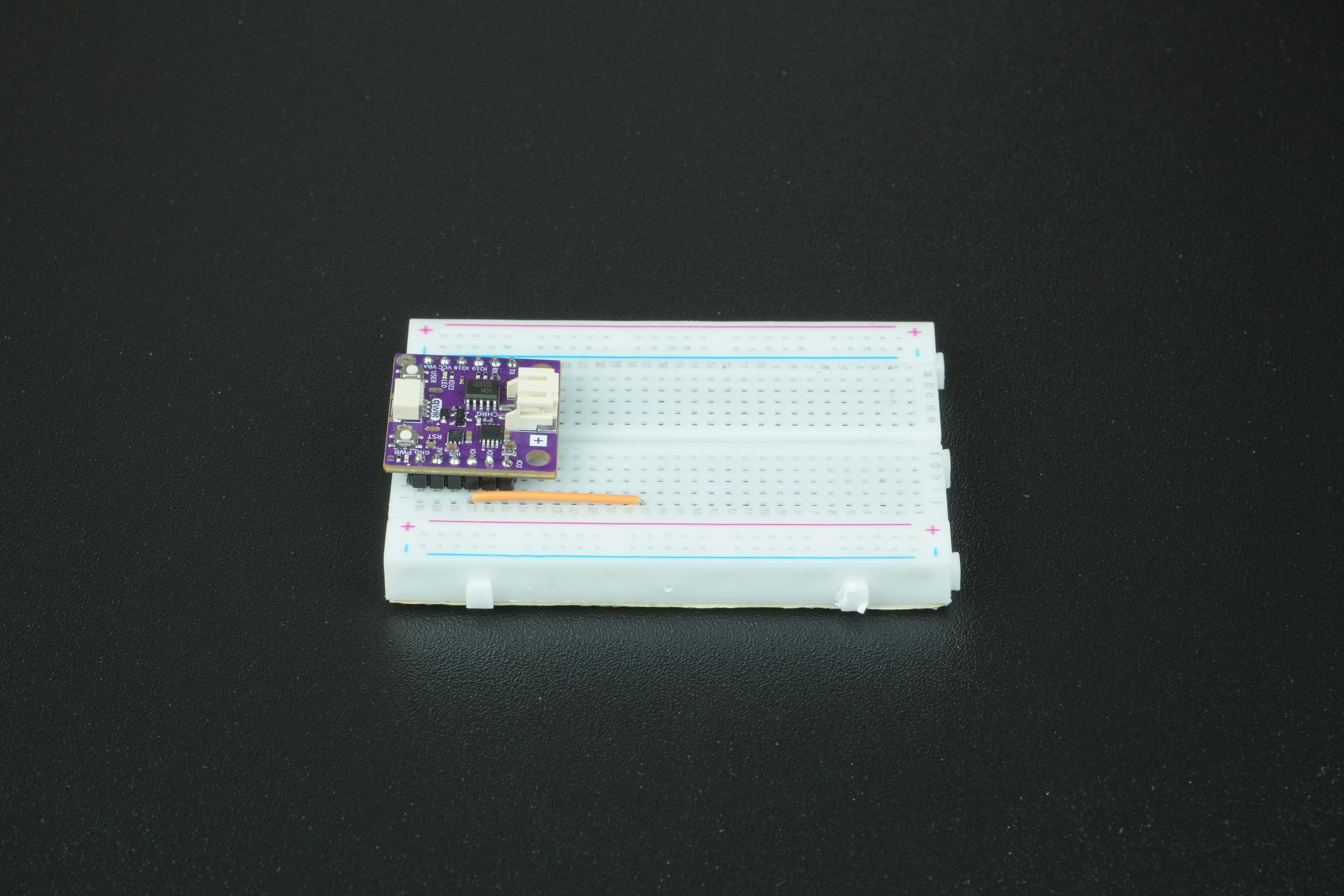 Take a piece of jumper wire and connect one end to an available GPIO pin on the board. For this example, we will be using IO4 pin. Connect the other end to any free (meaning nothing is connected to it!) power rail on the breadboard.