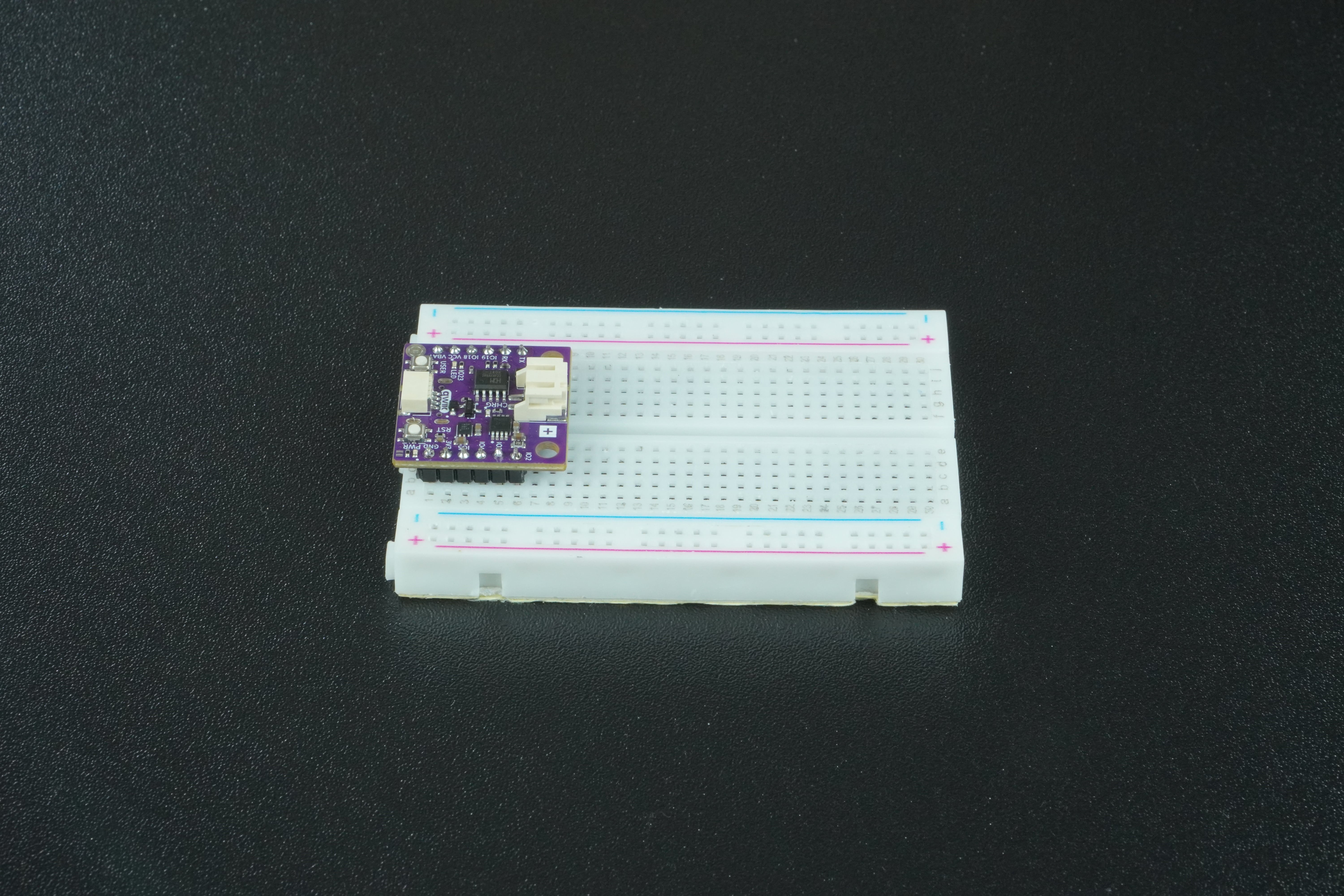 If your board has male connectors soldered to its pins, we recommend placing it on the breadboard to make it easier and tidyer for yourself to connect other components.