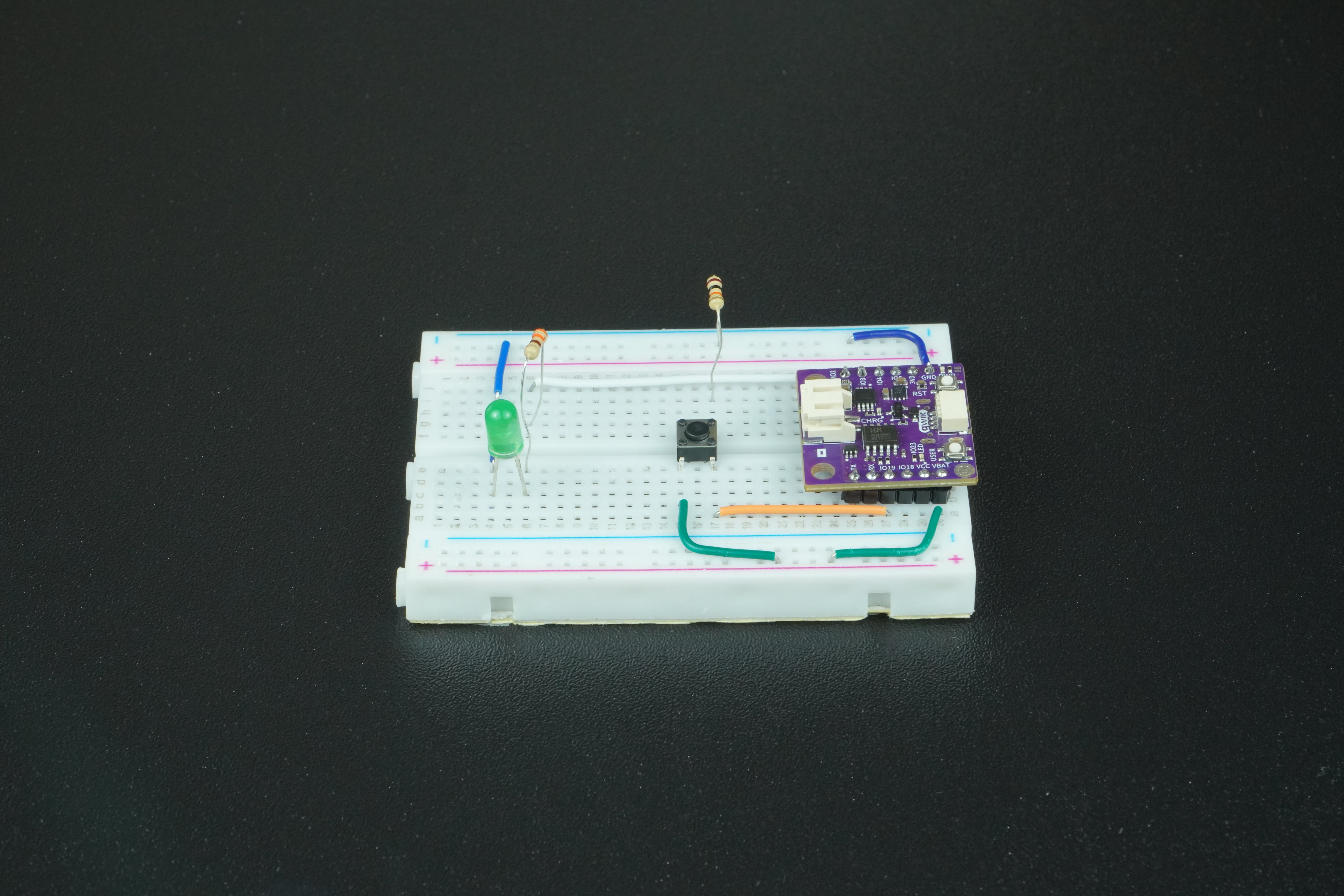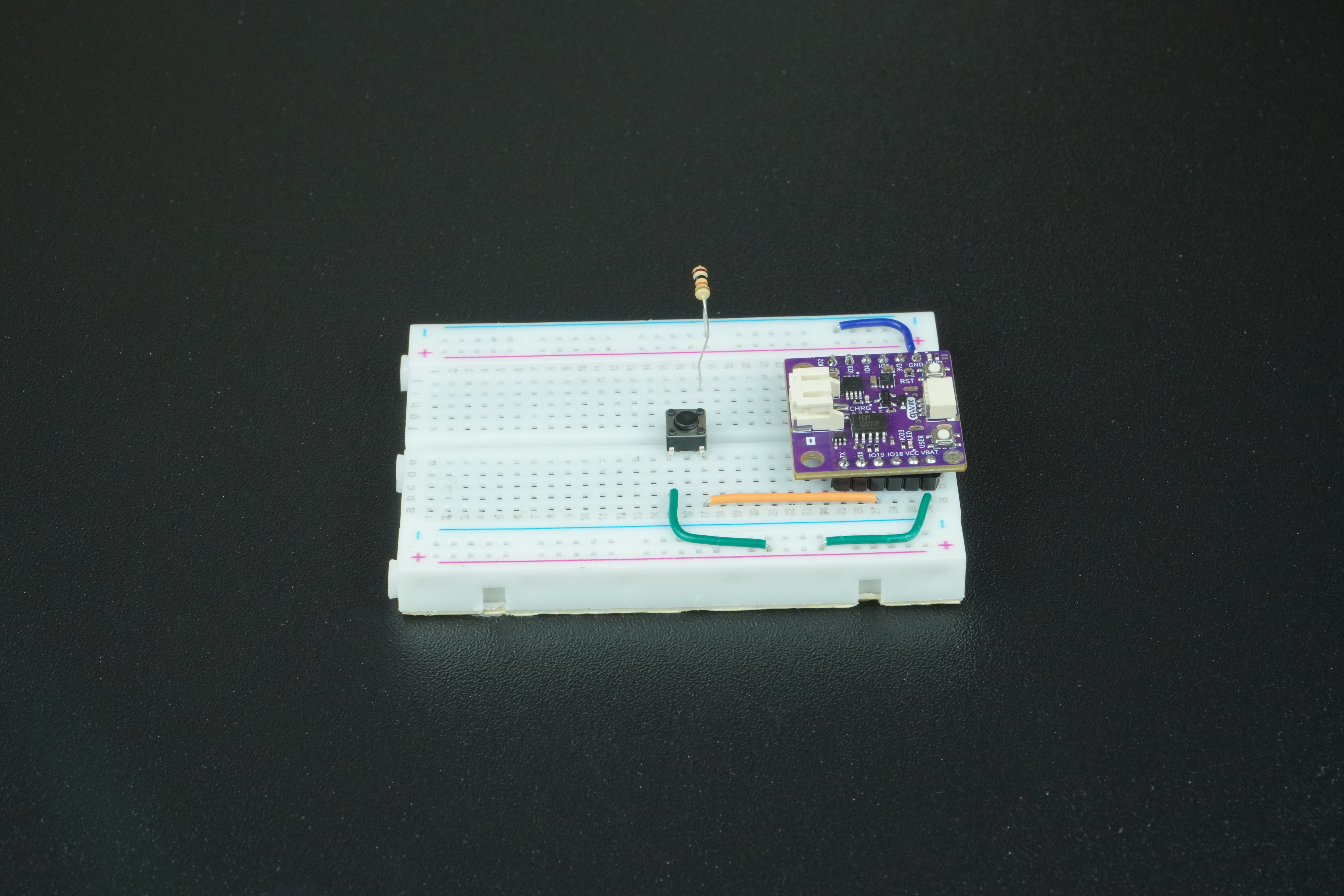 Using a jumper wire, connect IO19 on the NULA MINI to one leg of the push button on the breadboard. Connect the opposite leg of the button to GND through a 10kΩ resistor, and also connect that same leg to 3.3V. Your completed circuit should look like this: