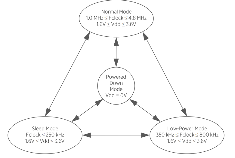 In Normal Mode, the clock frequency is between 1.0 MHz and 4.8 MHz with VDD = 1.6 V – 3.6 V.