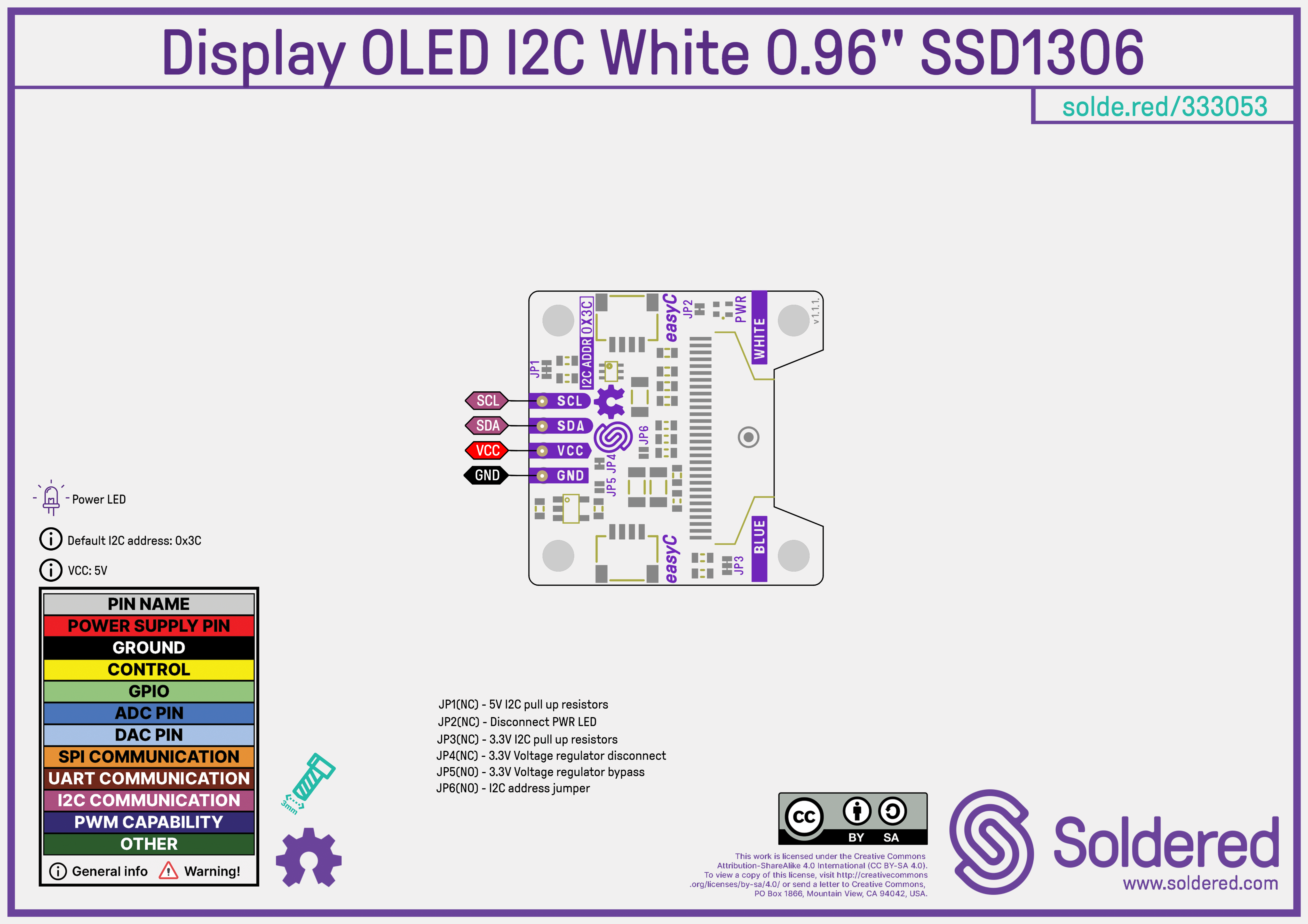 | JP6 | NO (Normally open) | I2C address jumper. When shorted, the address is 0x3D; if not, it is 0x3C. |
