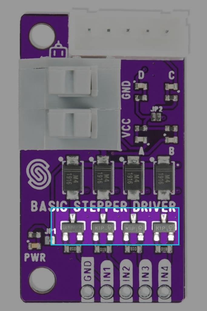 To help visualize the stepper motor operation, each transistor output is accompanied by an LED indicator. These LEDs light up when the corresponding transistor is activated, providing a real-time indication of which coil is currently energized. To activate the LED lights, JP2 must be bridged!