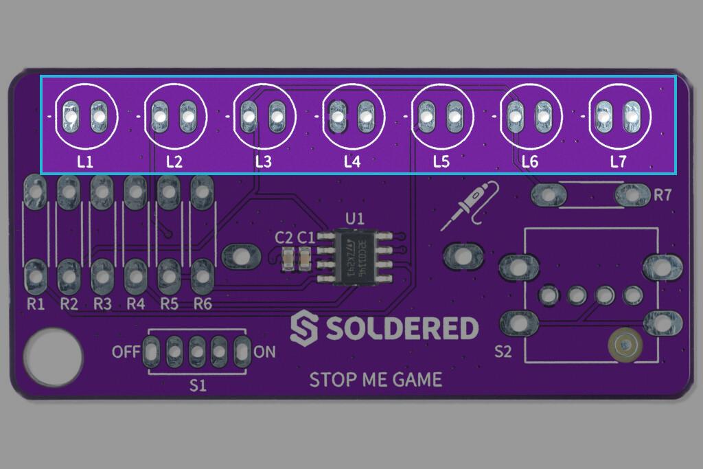 Solder the LEDs on pins marked L1 to L7. Keep in mind that the LED's cathode (-) is on the left pin, and anode (+) is on the right side!