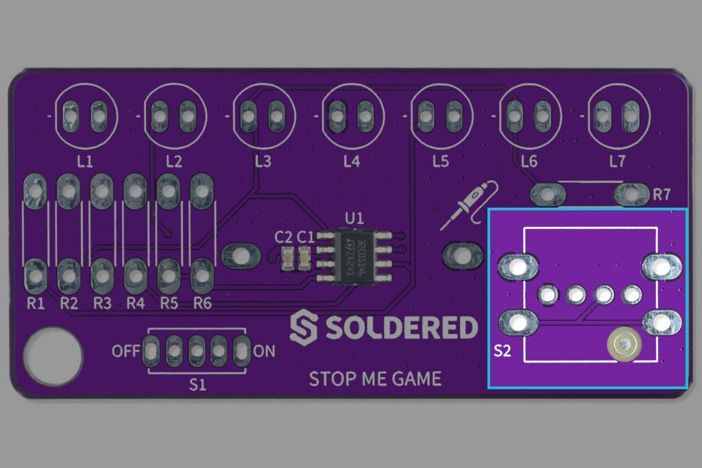 Solder the pushbutton on pins marked S2, orientation doesn't matter.