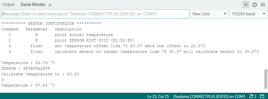 In this example, the loop() function listens for user commands via the Serial Monitor and executes corresponding actions such as temperature reading or calibration.
