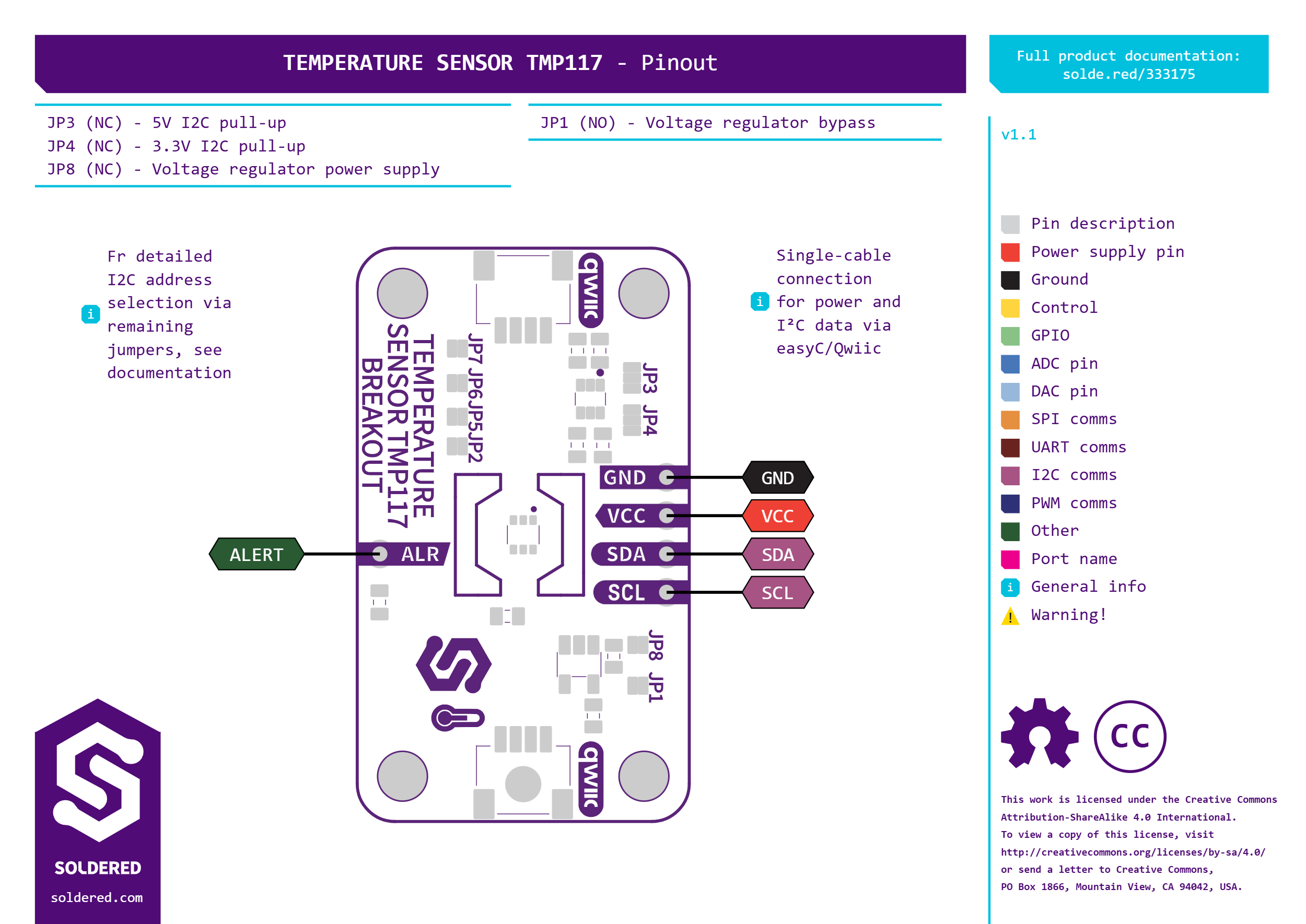 | JP2 | NC (Normally closed) | Connects ADD0 pin to 3.3V, setting I²C address accordingly. |